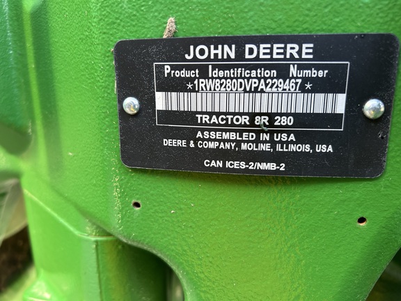2023 John Deere 8R 280 Tractor. Powershift Transmission. Gen 4 4600 display. Air seat plus cab suspension. Four SCVs. CAT 4 hitch and drawbar. Firestone tires. 420/85R34 147A8 R1W front duals. 480/80R50 159A8 R1W rear duals. Select Visibility package. Premium Comfort package. Call Ty for more information at 870-763-4434.